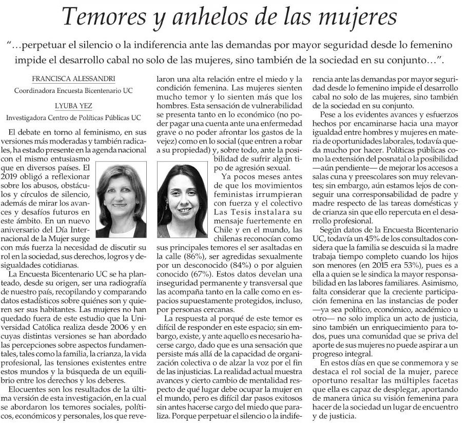 El Mercurio publica columna de Francisca Alessandri, coordinadora Encuesta Bicentenario UC, y de Lyuba Yez, investigadora del centro: “Temores y anhelos de las mujeres“.